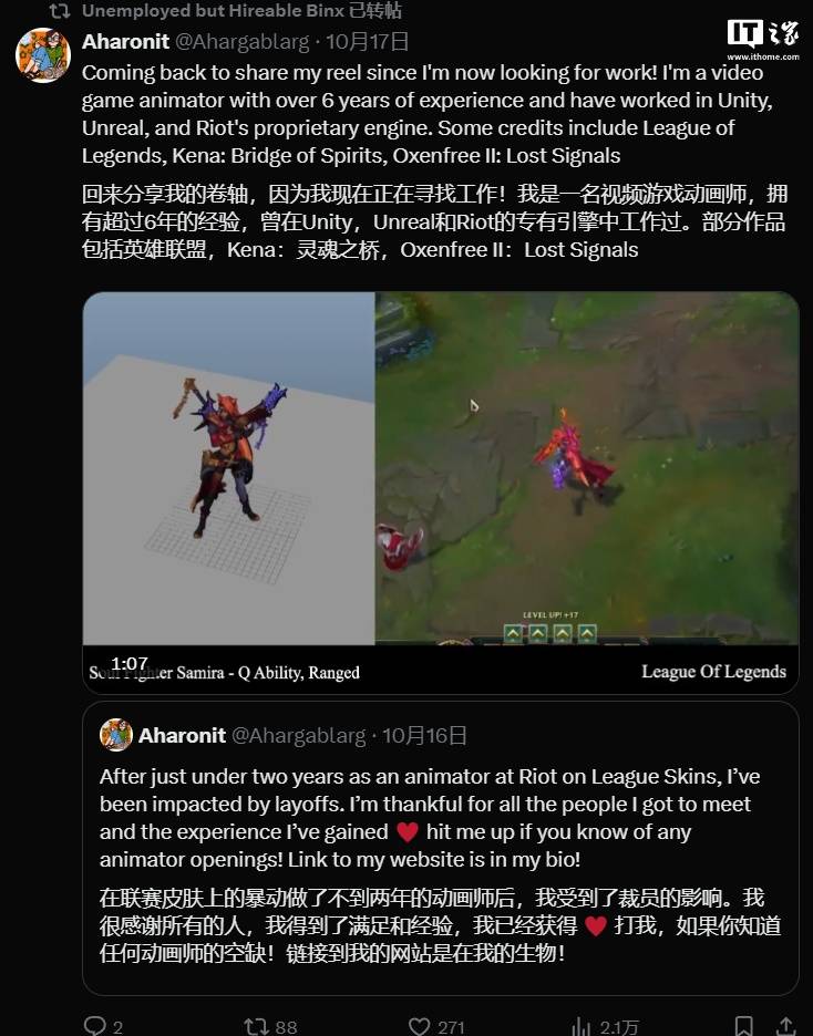 IT之家 10 月 18 日消息,拳头游戏 10 月 16 日宣布对《英雄联盟》团队进行裁员,目前已有多名相关游戏设计师被裁。